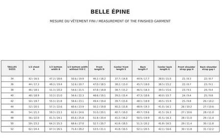 Le patron Belle Épine taille du 34 au 52. Le tableau des mesures du vêtement fini est disponible dans les photos du produit. Emilie porte Belle Épine en taille 36, Isabelle en taille 40 et Vanina en taille 50.