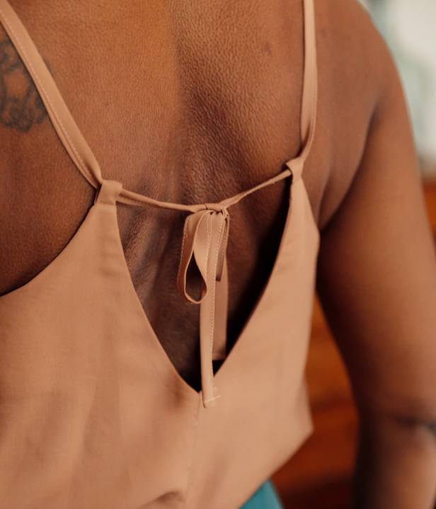 Niveau de couture : intermédiaire. Le gros point technique est la pose du biais encolure qui se prolonge pour former les bretelles.