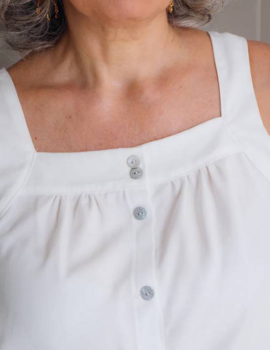 Choix du tissu : des tissus souples et confortables à porter comme une popeline de coton ou de viscose, un jacquard souple et doux, du crêpe de viscose, des sergés, du tencel mais également une dentelle ou broderie anglaise, Il faut privilégier des matières qui se repassent facilement pour réaliser plus facilement les bretelles.