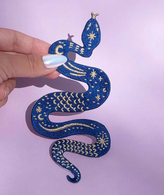 • Motif animal serpent avec détails lunes et étoiles en fils métalliques dorés