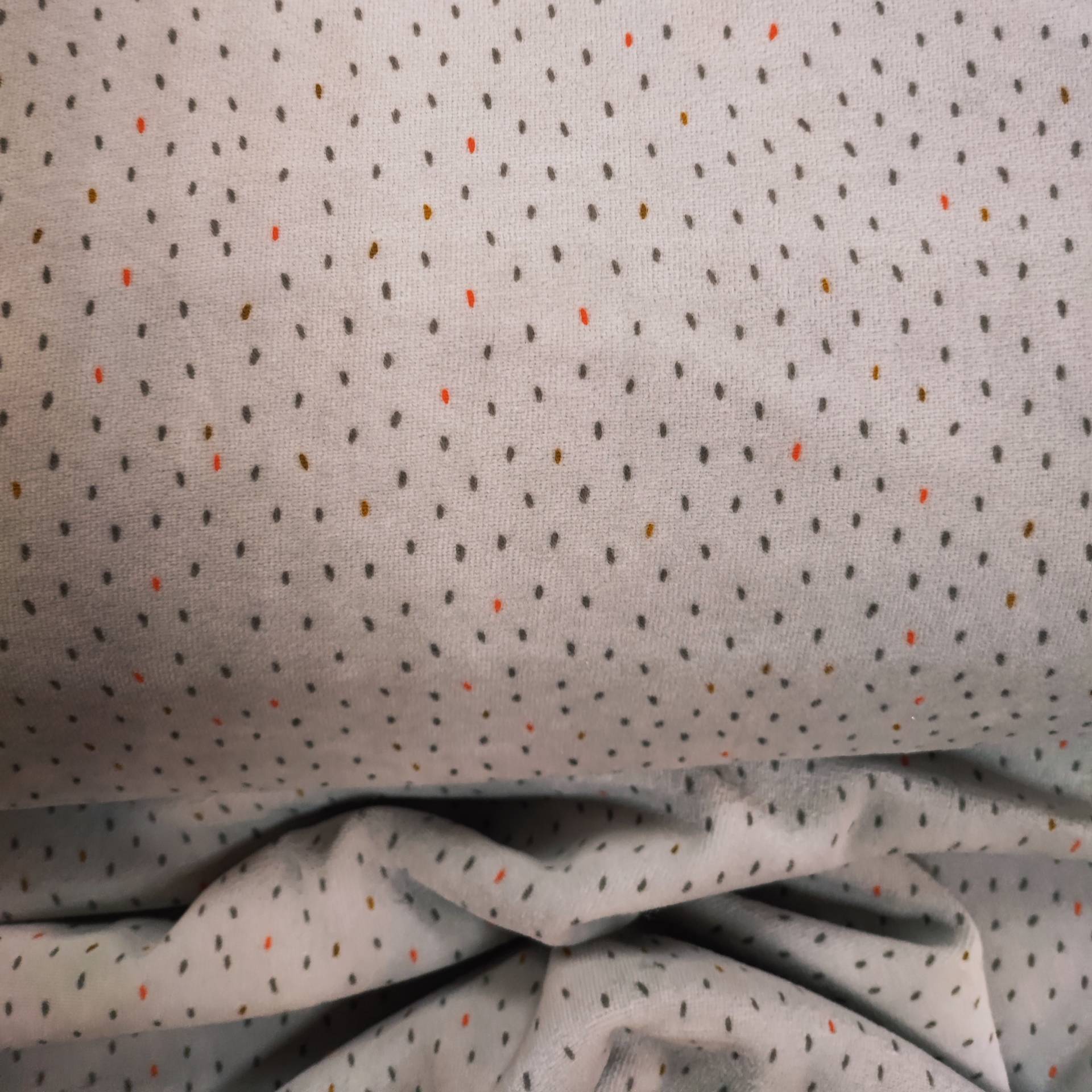 Tissu très doudou au toucher de couleur gris perle à poids orange, gris et moutarde.