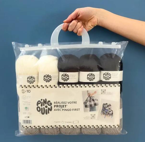 2 sachets de Pingo First Vichy = 1 Plaid Ce modèle spécialement créé pour vous est disponible gratuitement via le QR code présent sur le sachet et directement sur le site !