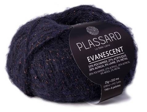 Evanescent est un fil lace à la fois léger et poétique composé d’alpaga (26%), de laine (9%), de polyamide (33%) et d’acrylique (27%) le tout agrémenté d’un fil métallisé (5%).