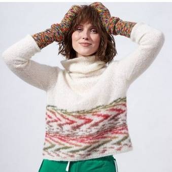 Son joli jacquard multico se tricote uniquement en jersey endroit, sans faire de changements de couleurs, de points et de pelotes.