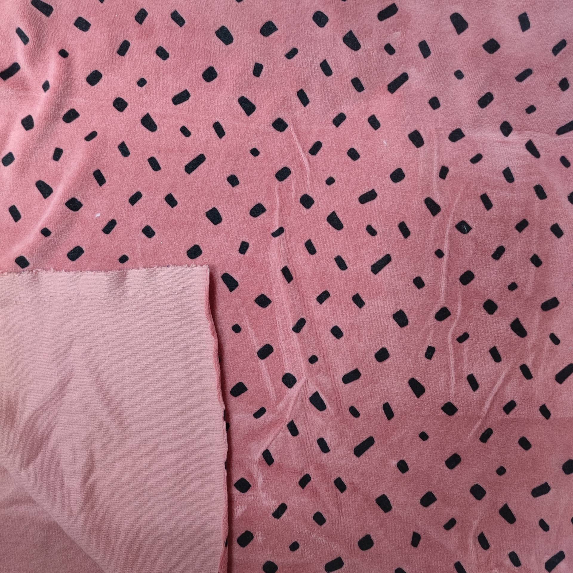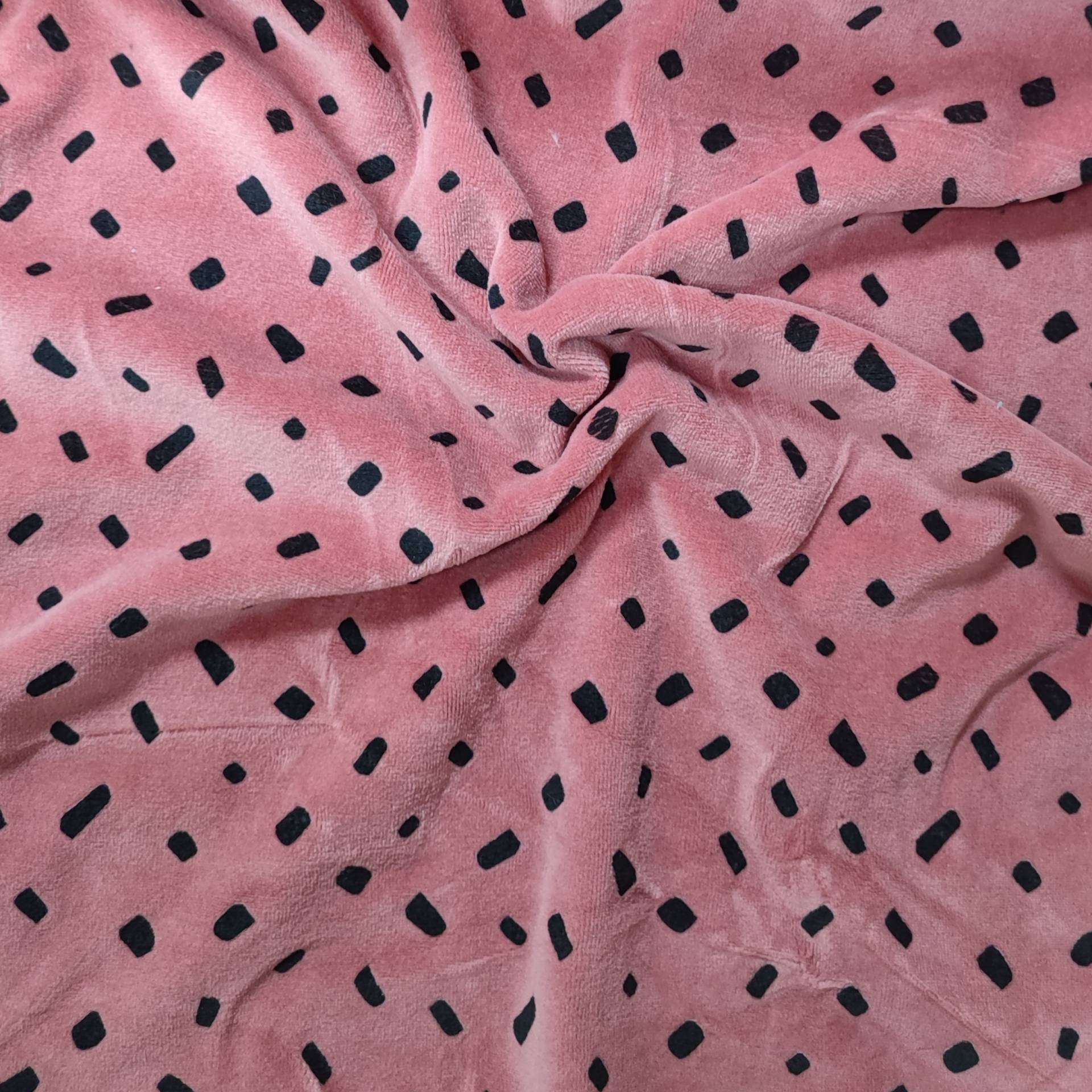 Tissu très doudou au toucher de aux taches noir sur fond vieux rose