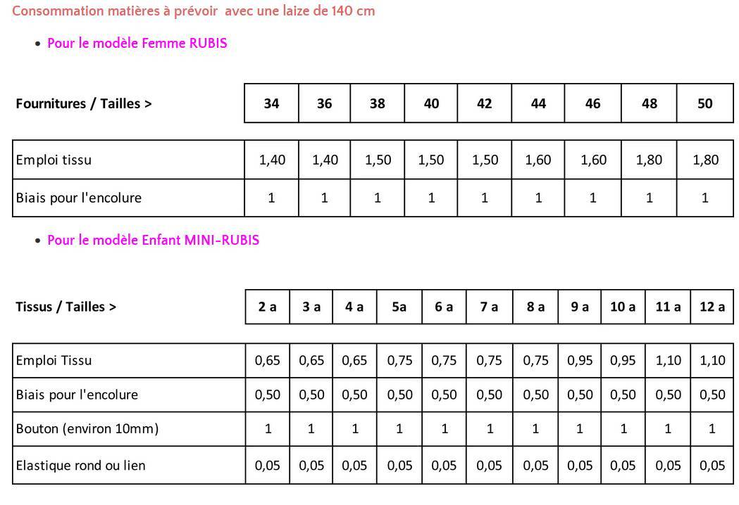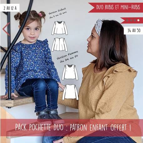 Ce patron se présente sous la forme d’une jolie pochette comprenant la planche de patron à taille réelle du modèle femme RUBIS gradé du 34 au 50 ainsi que le patron à taille réelle du modèle enfant MINI-RUBIS gradé du 2 au 12 ans et la notice brochée en couleur avec le pas à pas illustré.