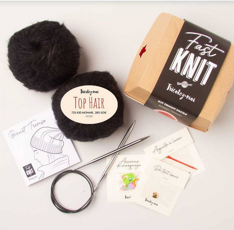 La box tricot Fast Knit contient tout le nécessaire pour réaliser le bonnet Tromso : les pelotes de laine mohair et soie, les aiguilles à tricoter en option, l’aiguille à laine, des anneaux de marquage et le patron de tricot avec toutes les explications pas à pas.