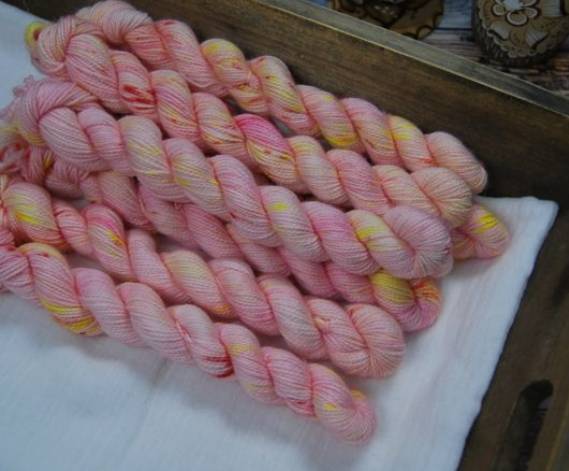 Chaque écheveau est teint à la main, en petit nombre par bain ce qui le rend unique. Il est recommandé d’alterner les écheveaux au fil du projet.