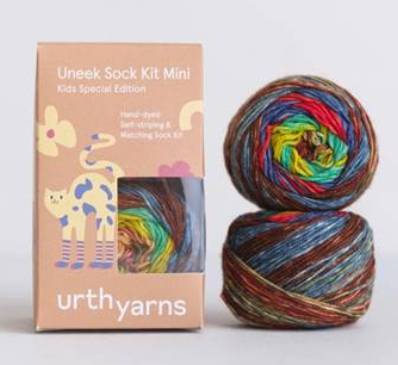 Pensé pour les plus petits, le Uneek Sock Kit Mini de Urth Yarns propose deux mini-pelotes parfaitement assortis pour réaliser une paire de chaussettes enfant auto-rayantes. Les rayures se forment toutes seules, sans effort, pour un rendu harmonieux.