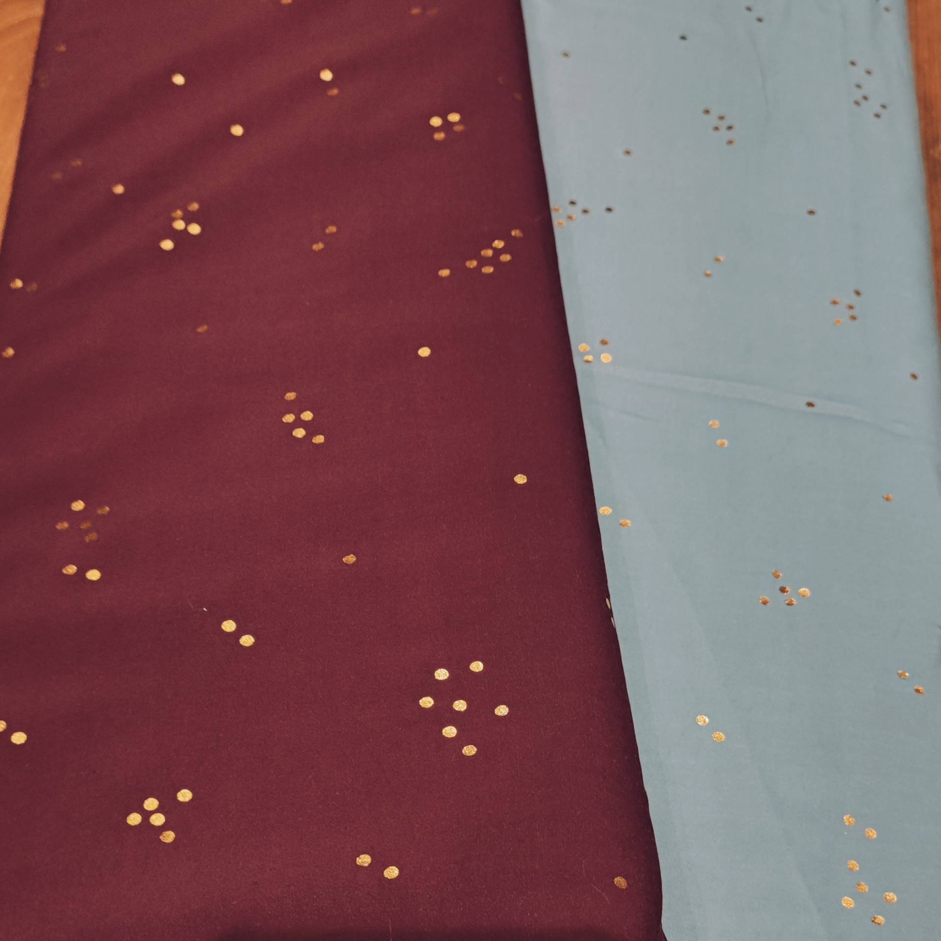 Couleur : fond gris bleuté avec des points or
