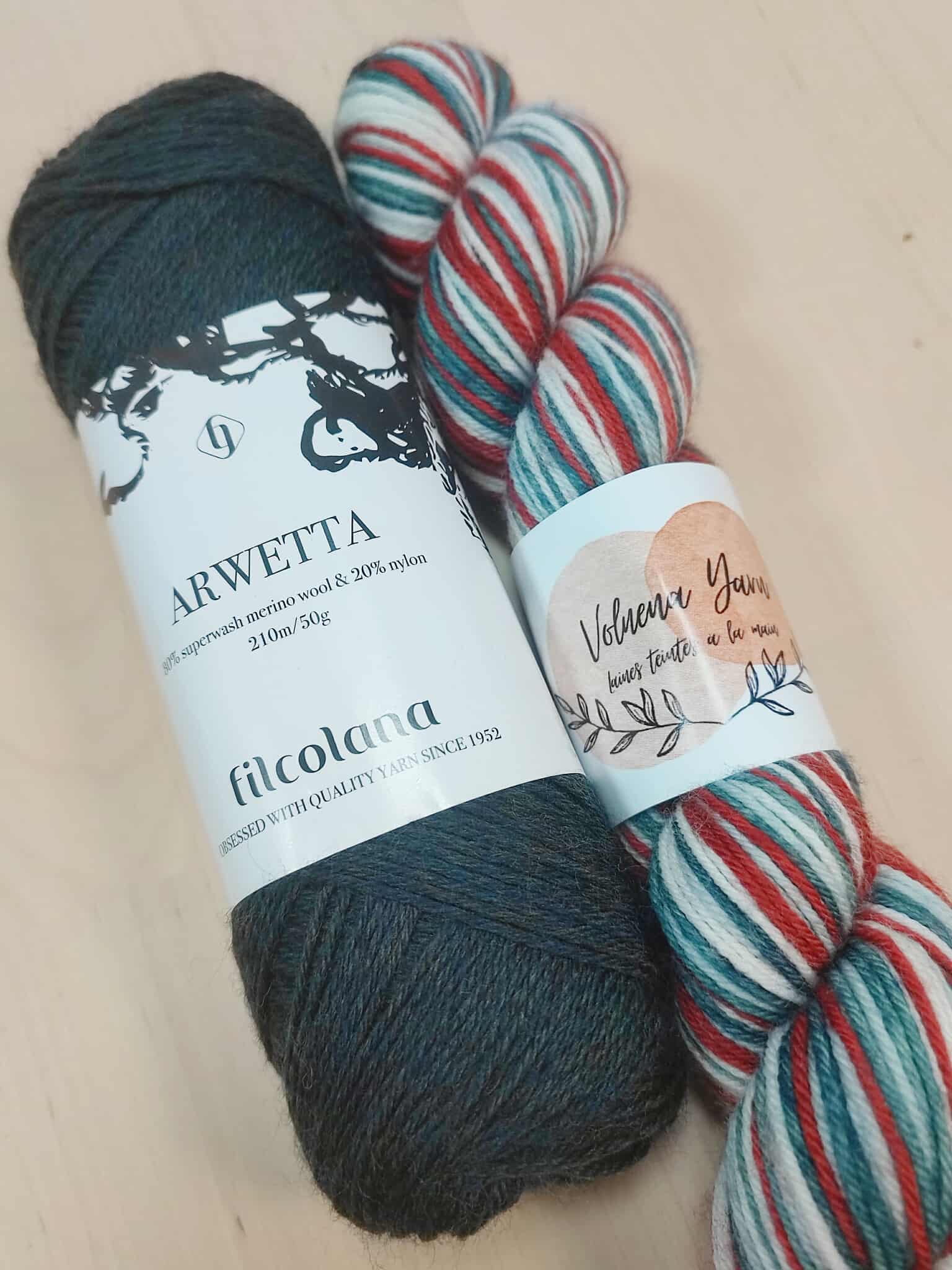 Echeveaux de 50g, associé à un mini de 20g ou une pelote de contrastant Arwetta coloris 679,