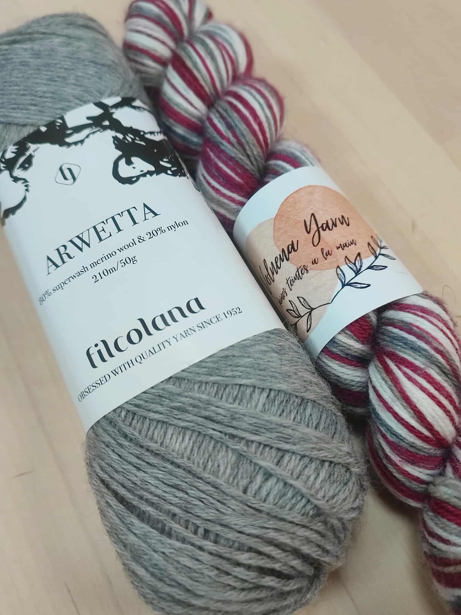 Echeveaux de 50g, associé à un mini de 20g ou une pelote de contrastant Arwetta coloris 954,
