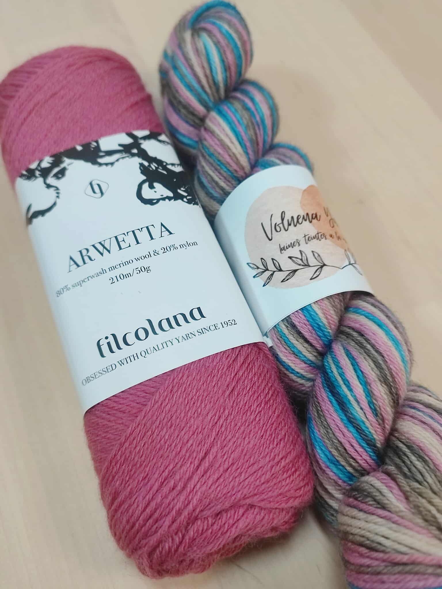 Echeveaux de 50g, associé à un mini de 20g ou une pelote de contrastant Arwetta coloris 187,